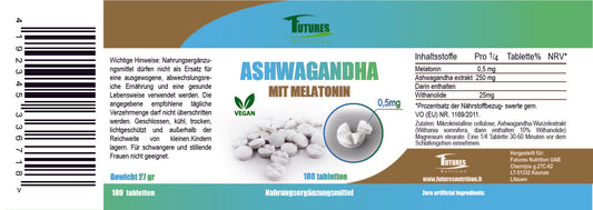 Ashwagandha mit Melatonin 180 Tbaletten Verbesserung der Schlafqualität + Stressbewältigung